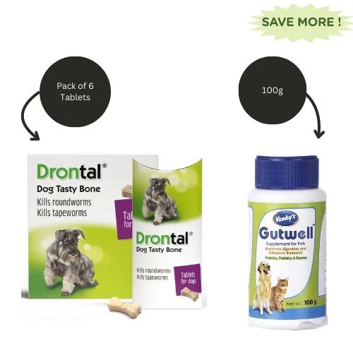 Drontal Plus Tasty Dog Deworming Tablet (pack of 6 tablets) and Venkys Gutwell Pre & Probiotics Gut Health Powder (100g) for Dogs and Cats Combo