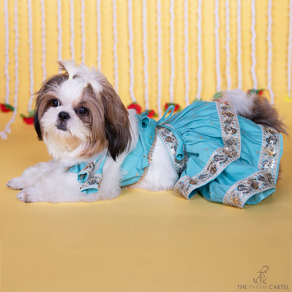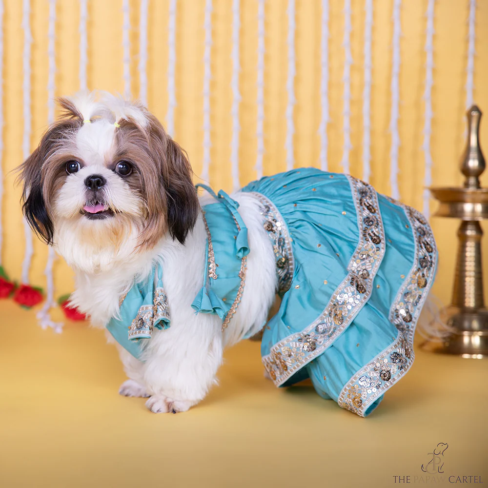 The Papaw Cartel Two Tiered Zardosi Lehenga With Stylish Choli for Dogs & Cats (Blue)