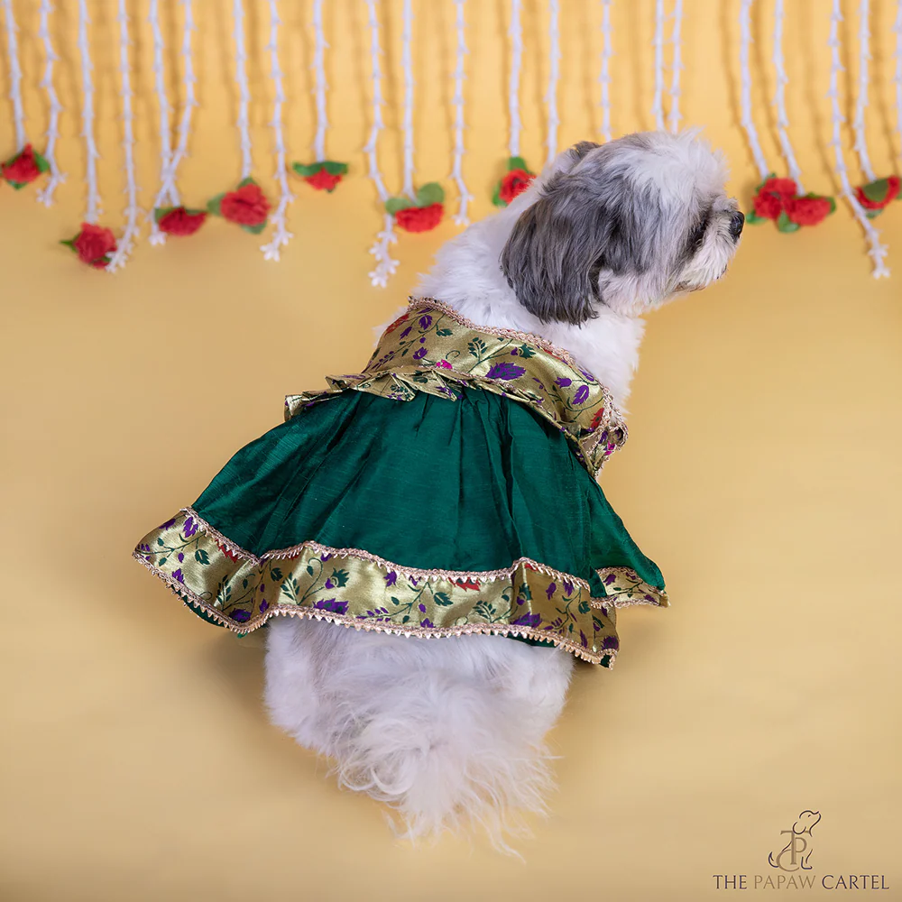 The Papaw Cartel Paithani Tie Up Dress with Gotapati for Dogs & Cats (Green)