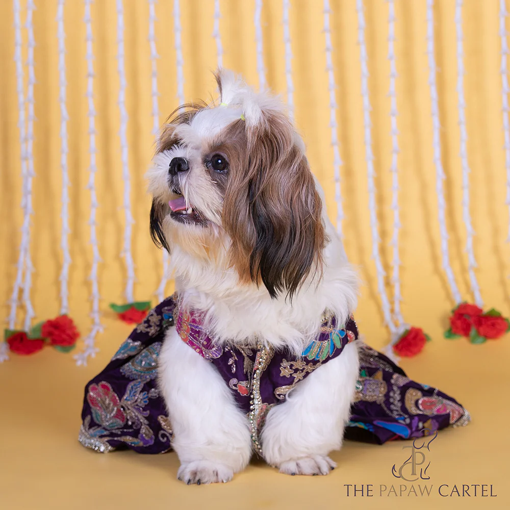 The Papaw Cartel Motif Embroidered Lehenga Choli for Dogs & Cats (Purple Paisley)