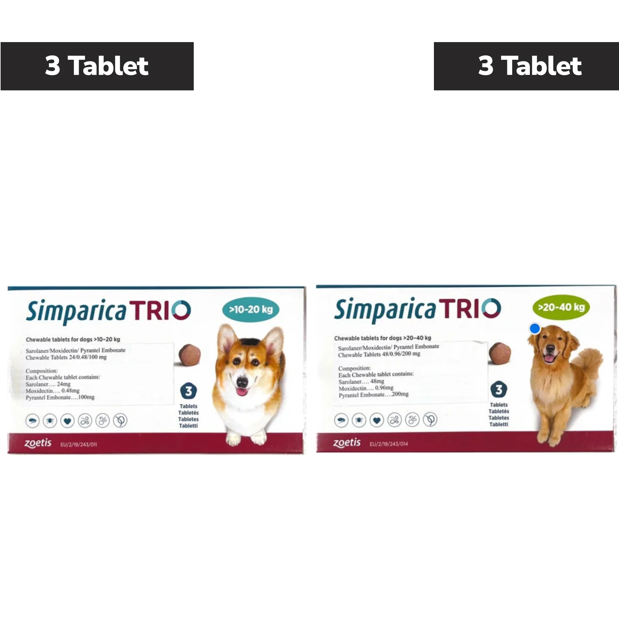 Zoetis Simparica Trio (Sarolaner) Tick & Flea Control Tablet for Dogs 10 to 20 kg (3 Tablets) and 20 to 40 kg (3 Tablets) Combo