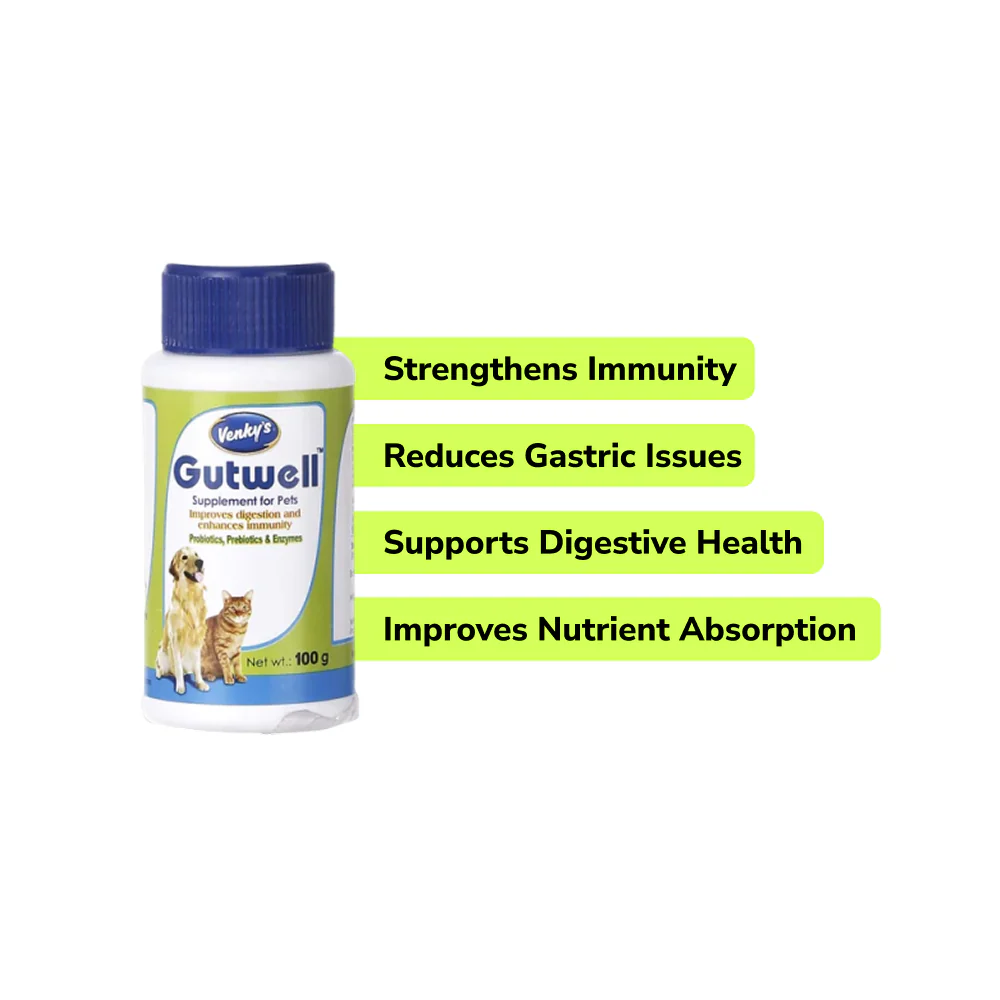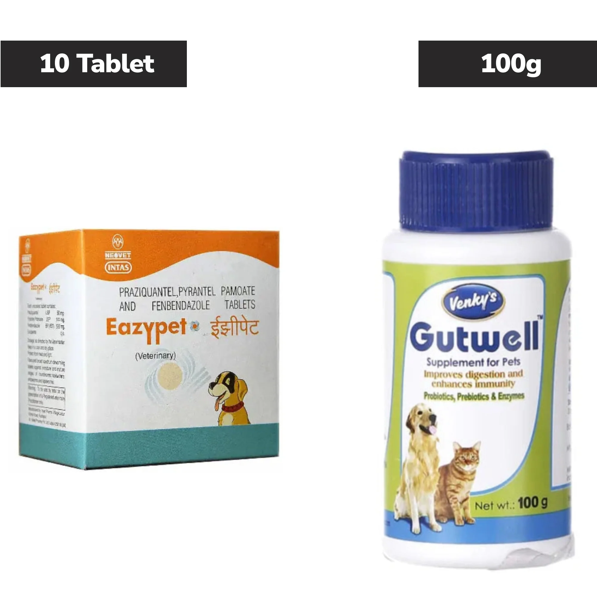 Intas Eazypet Deworming Tablet (10 Tabs) and Venkys Gutwell Pre & Probiotic Powder 100g for Dogs & Cats Combo
