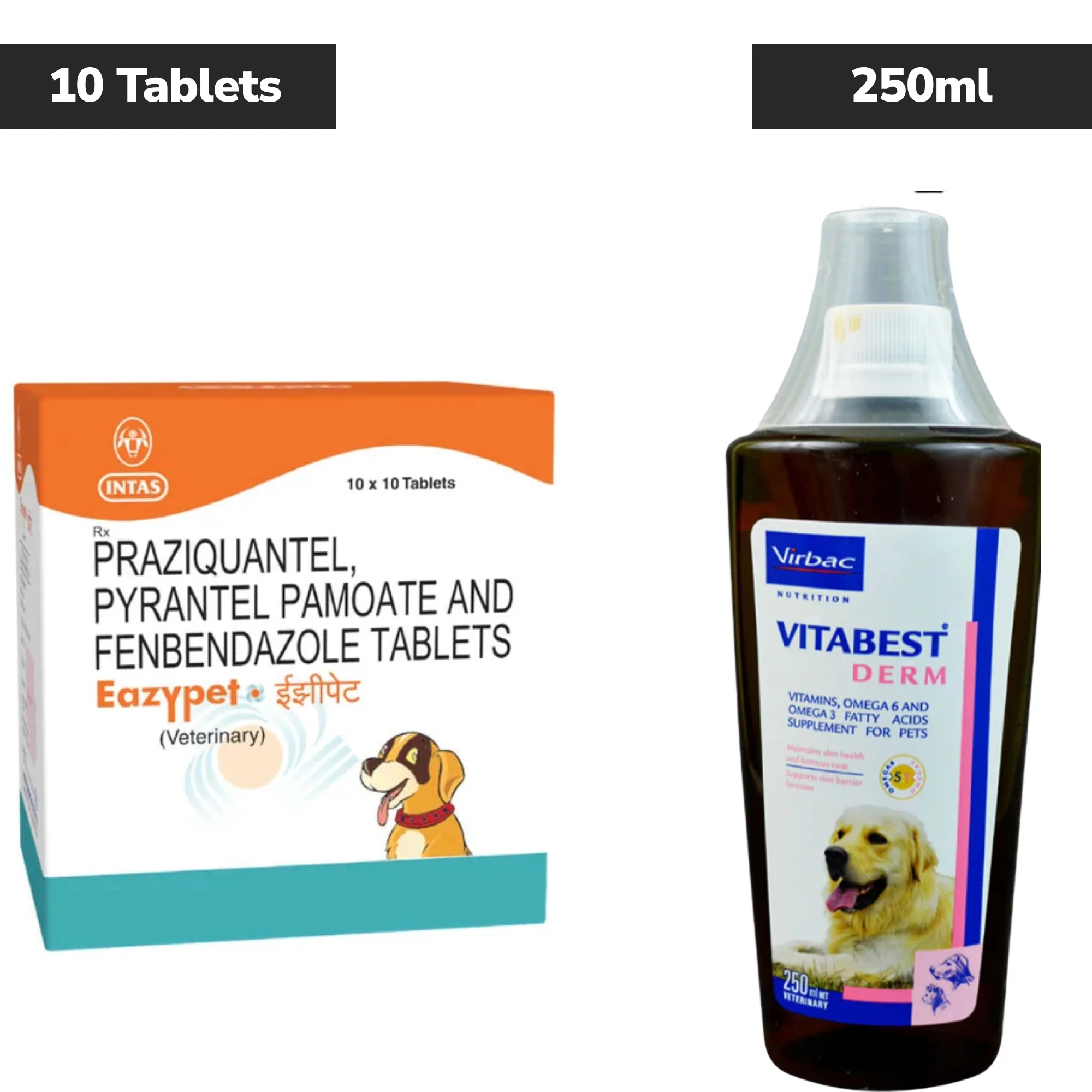 Intas Eazypet Dog Deworming Tablet (pack of 10 tablets) and Virbac Vitabest Derm Omega 3+6 Syrup for Dogs & Cats (250ml) Combo