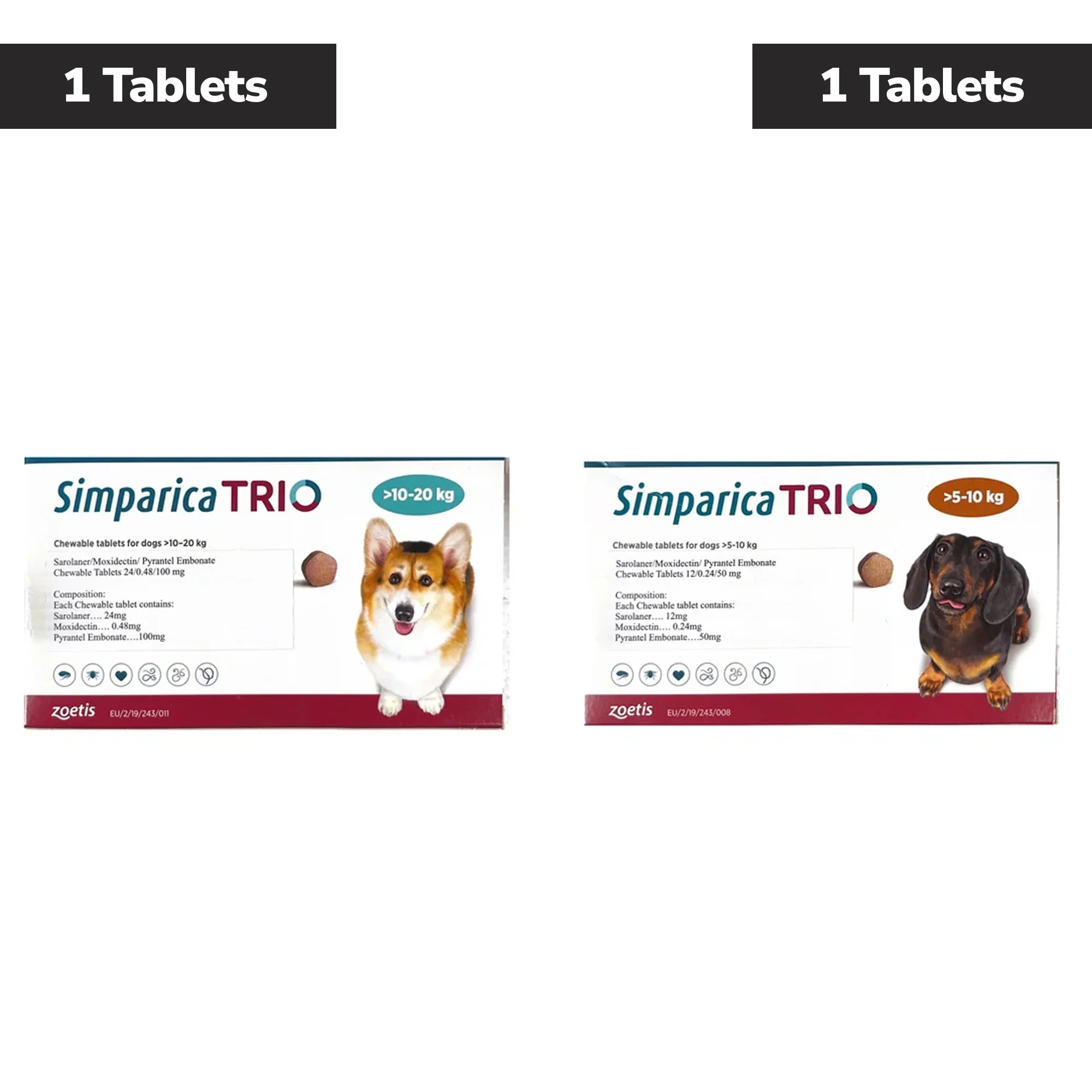 Zoetis Simparica Trio (Sarolaner) Tick & Flea Control Tablet for Dogs 5 to 10 kg (1 Tablet) and 10 to 20 kg (1 Tablet) Combo