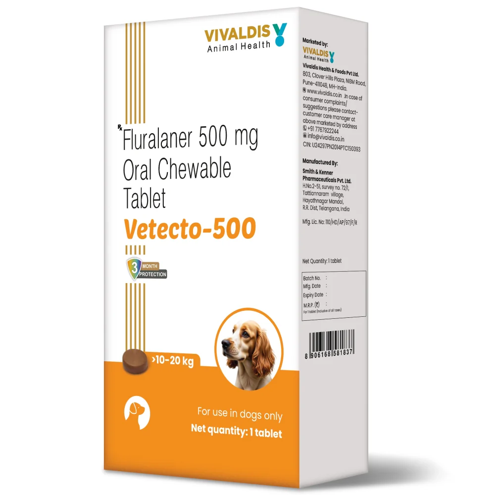 Vivaldis Vetecto 500 (Fluralaner) chewable Tick & Flea tablet for Dogs (10 to 20 kg)