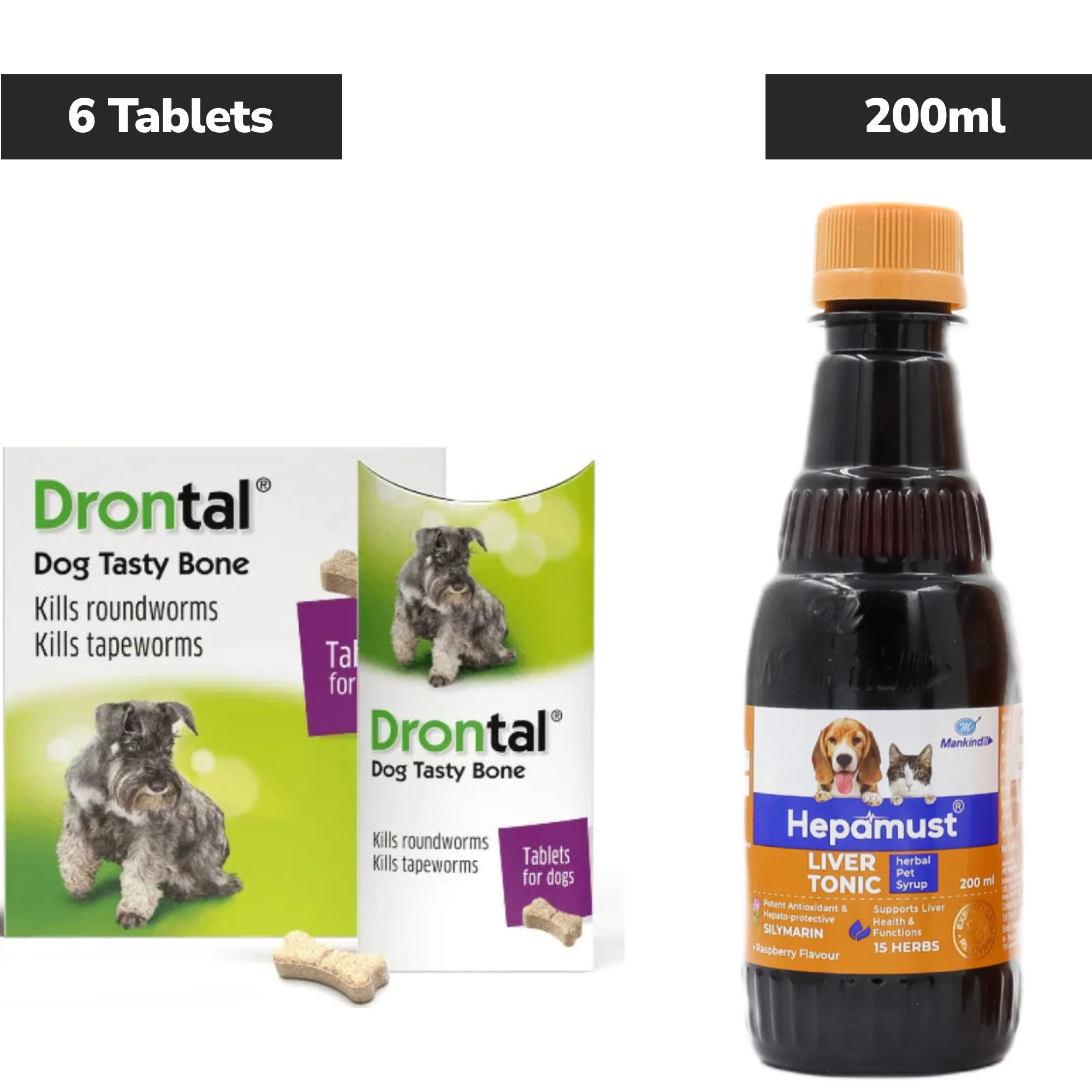 Drontal Plus Tasty Deworming Tablet for Dogs (6 Tabs) and Mankind Hepamust Liver Tonic 200ml Combo