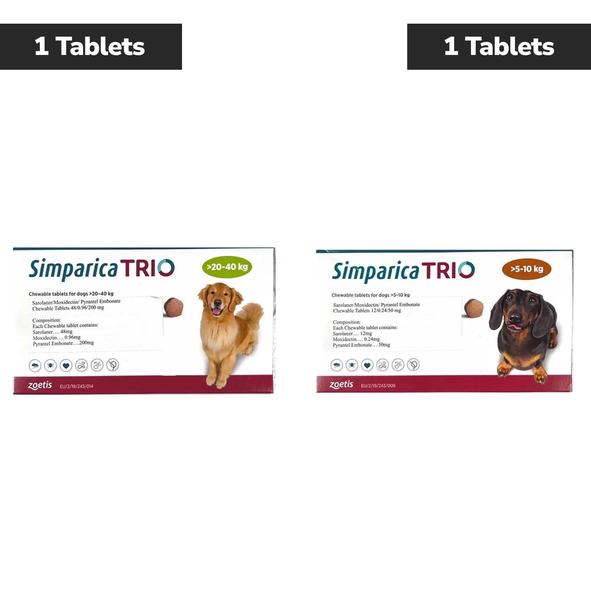 Zoetis Simparica (Sarolaner) Tick & Flea Control Tablet for Dogs 10 to 20 kg (1 Tablet ) and 20 to 40 kg (1 Tablet ) Combo