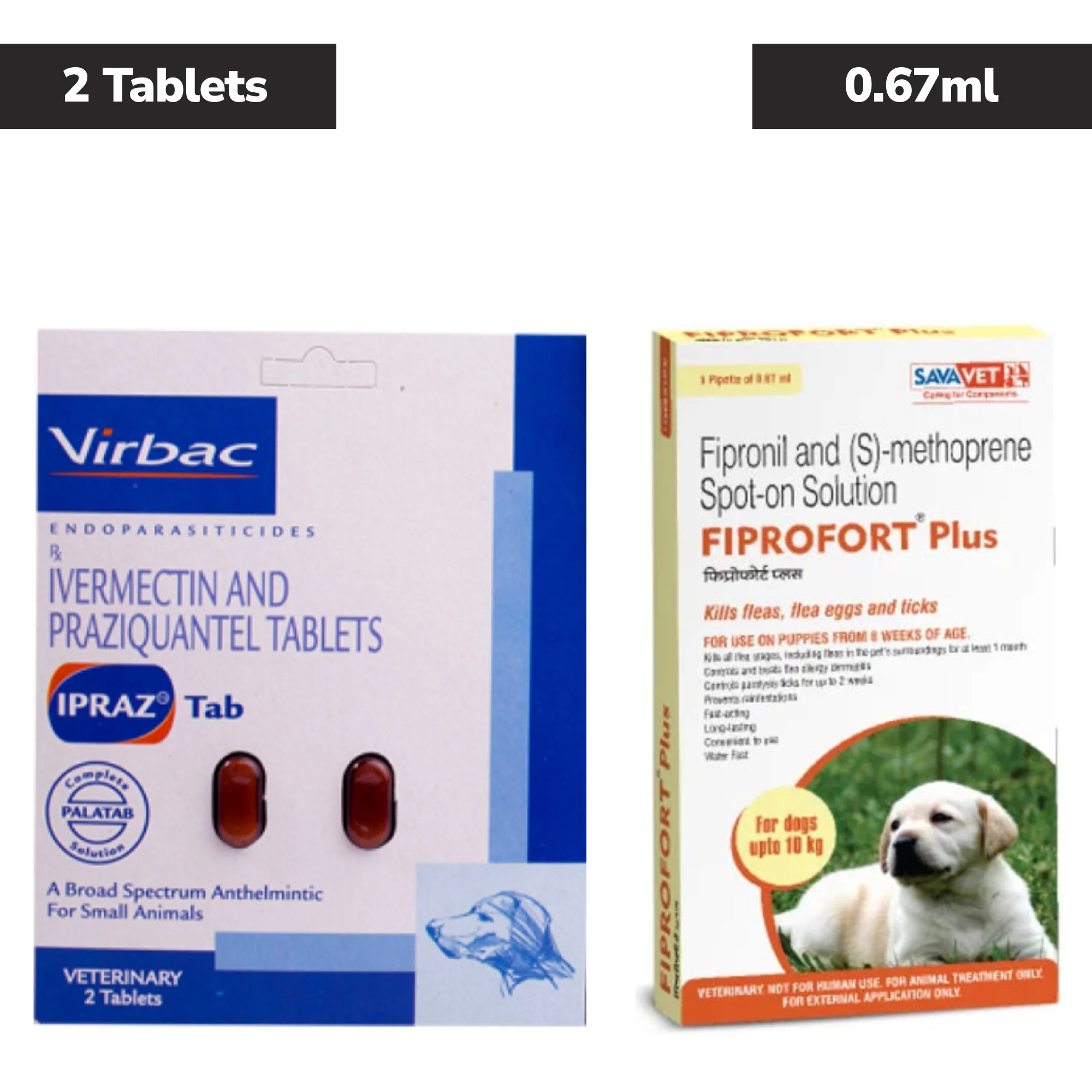 Virbac Ipraz Dewormer Tablets for Dogs (2 tablets) and Savavet Fiprofort Plus (Fipronil) Tick & Flea Control Spot On for Dogs Upto 10kg Combo