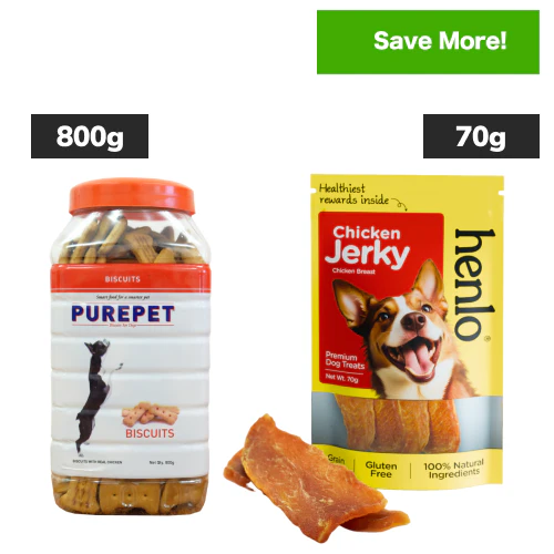 Purepet Chicken Flavour Real Chicken Biscuit and Henlo Chicken Jerky Dog Treats Combo